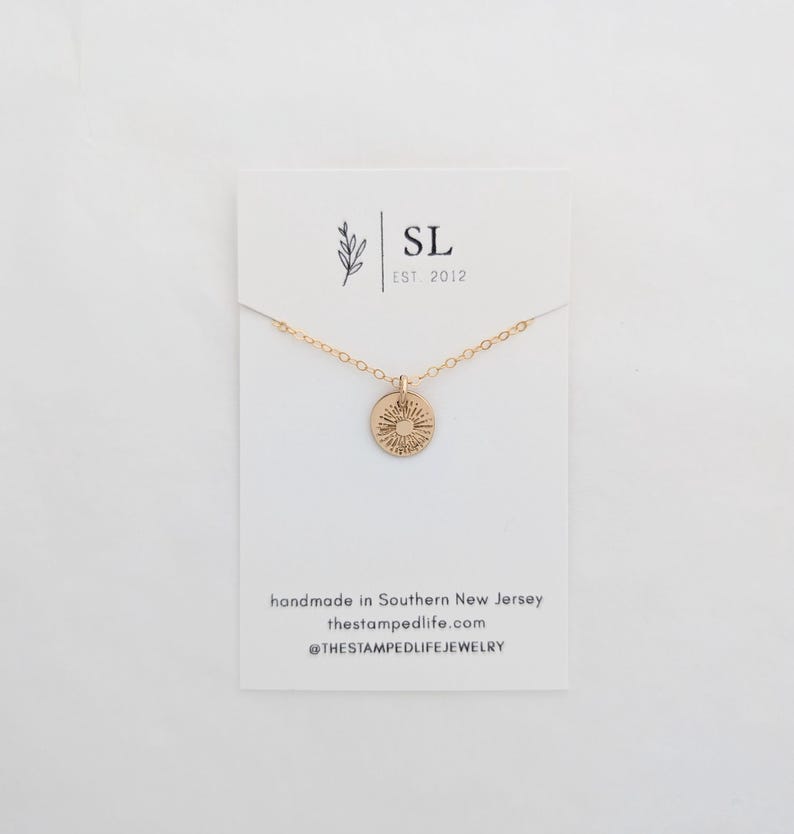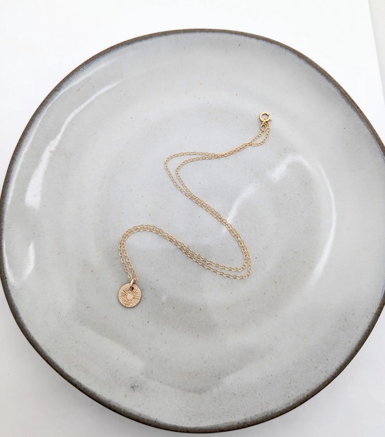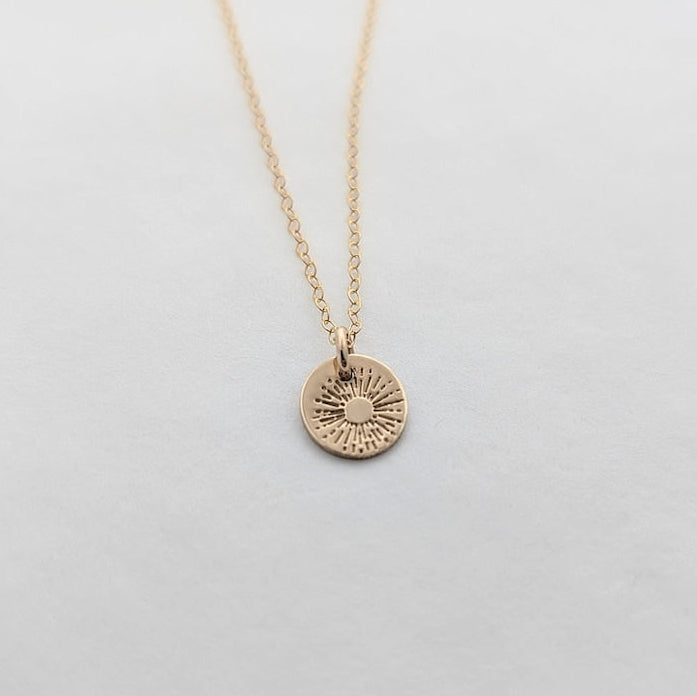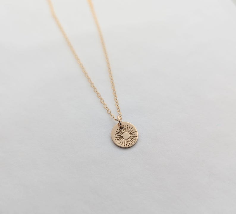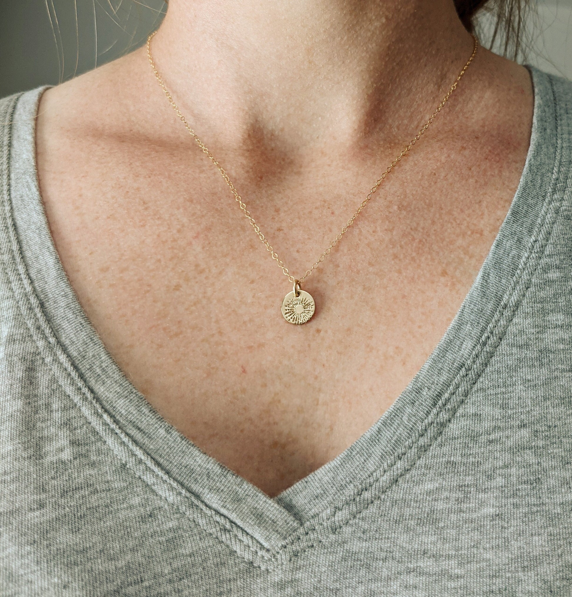 Gold Sunburst Necklace This tiny charm measures 3/8" (9.5mm) and is hammered with a sunburst design. Includes a cable chain in your choice of length (16"-20"). Selection can be made from the drop down menu. All components of this necklace are 14k gold fill