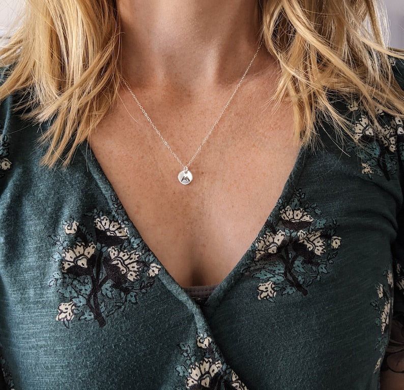 Charm measures 3/8" (9.5mm) and is personalized with a tiny mountain design. Includes a cable chain in your choice of length (16"-20") Available in solid .925 sterling silver or 14k gold fill. Selection can be made from the drop down menu.