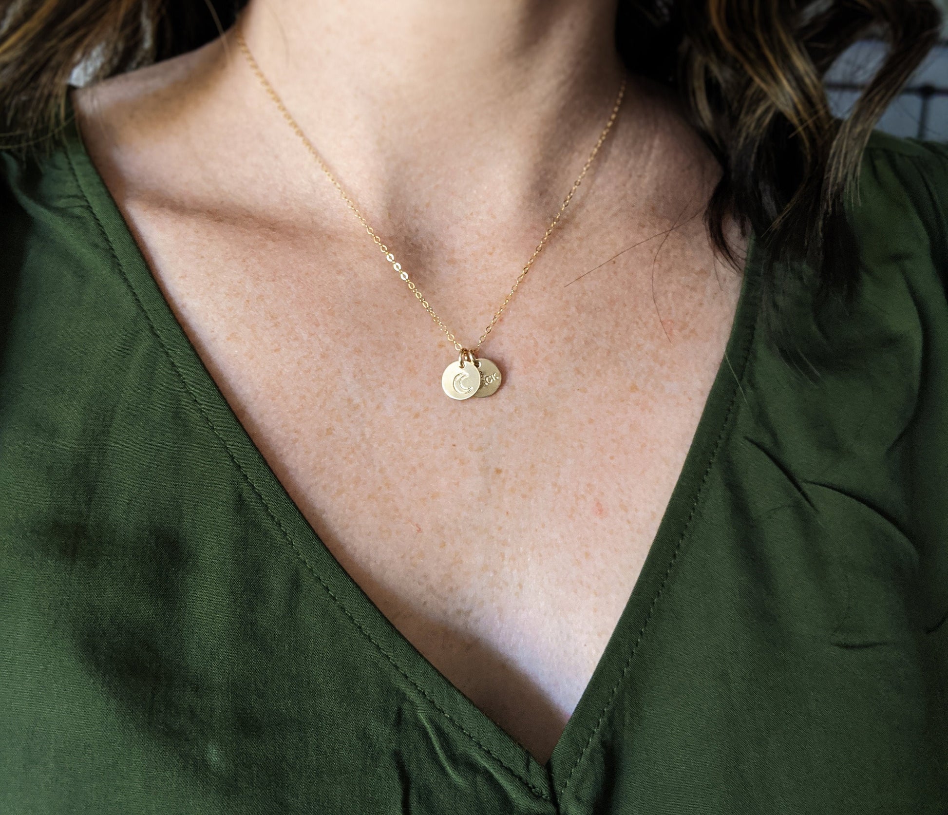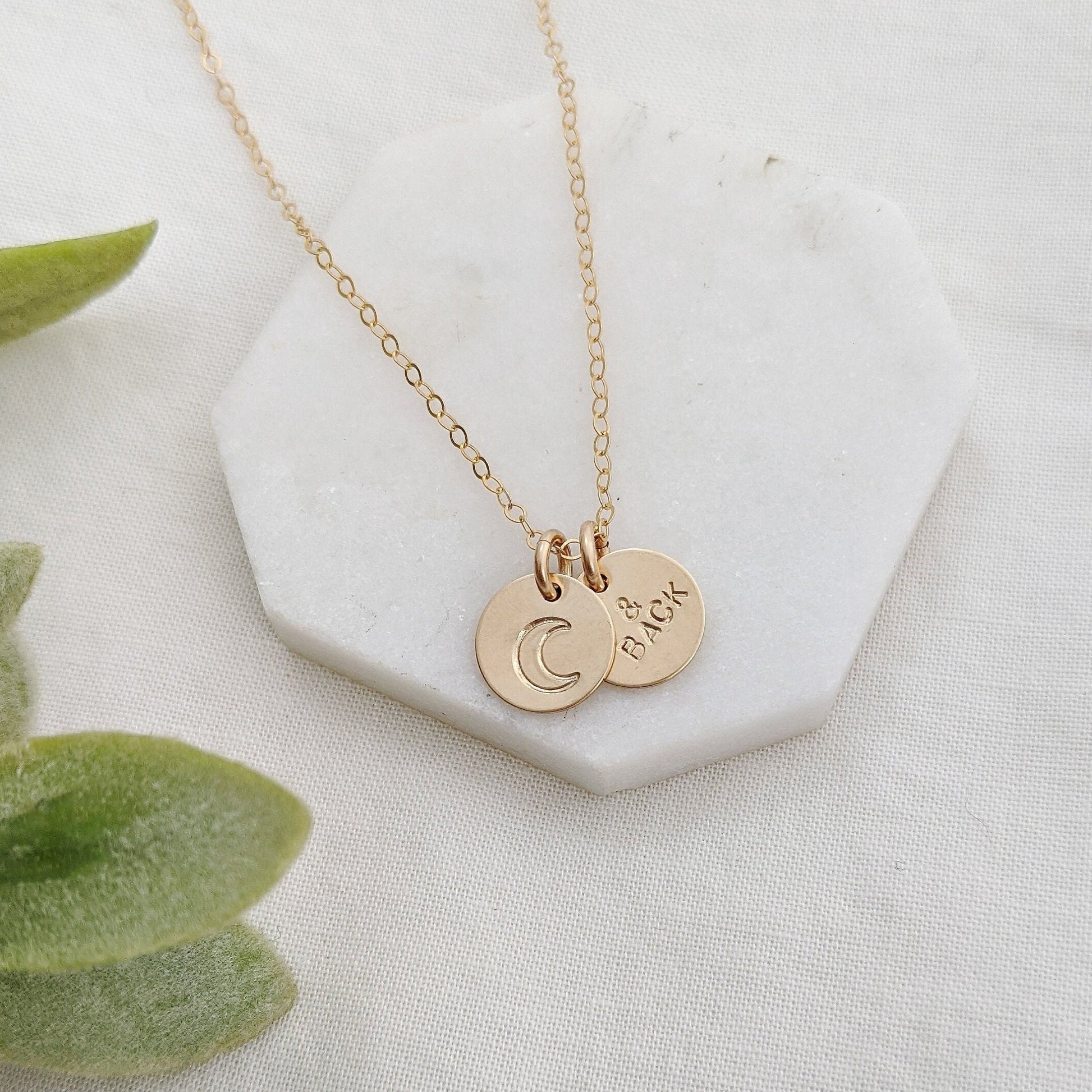 To the moon and back necklace. Includes two 3/8 inch charms. One personalized with a moon design and the other charm personalized with "& BACK". The perfect minimal, dainty everyday necklace.