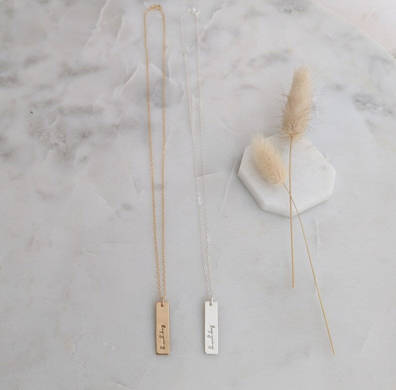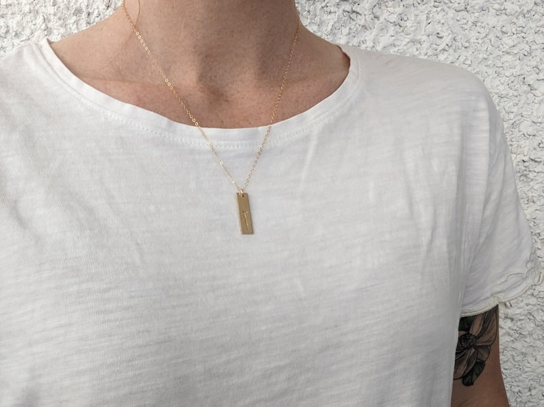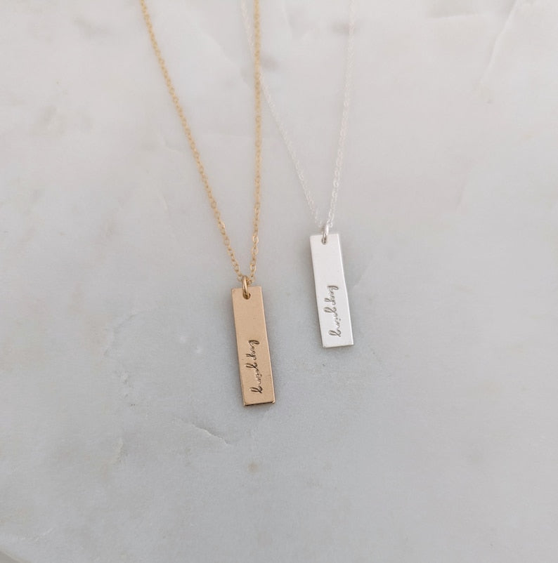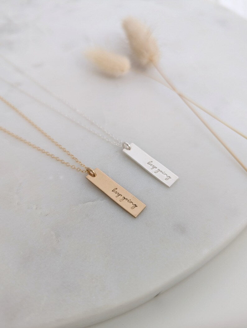 "Keep going" bar charm necklace. Created and finished by hand. The perfect, simple, everyday reminder to never give up. This tiny barely there font won't call out attention keeping this peace personal and meaningful to you. Charm measures 1/4 by 1". All components of this necklace are solid sterling silver 14k gold fill.
