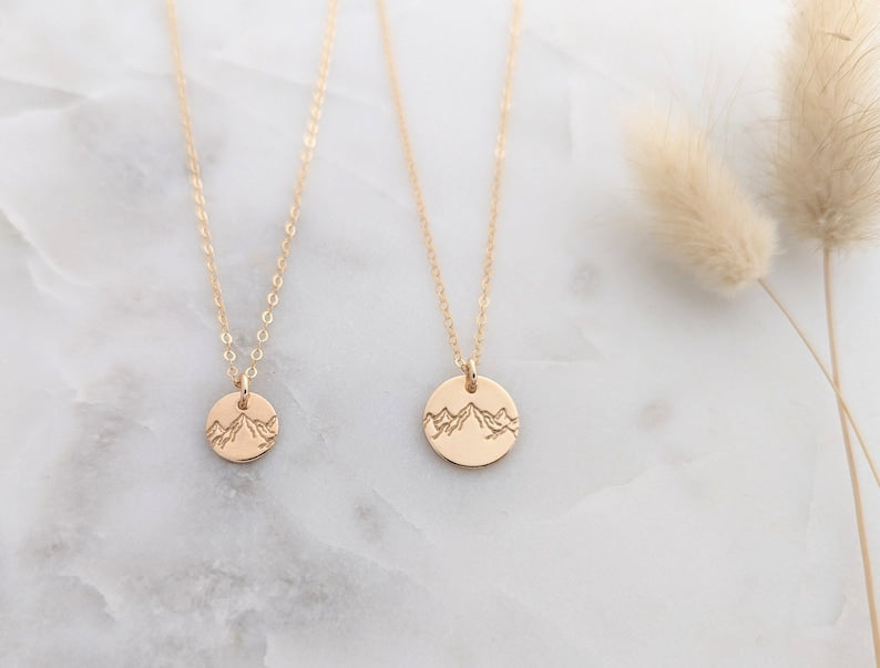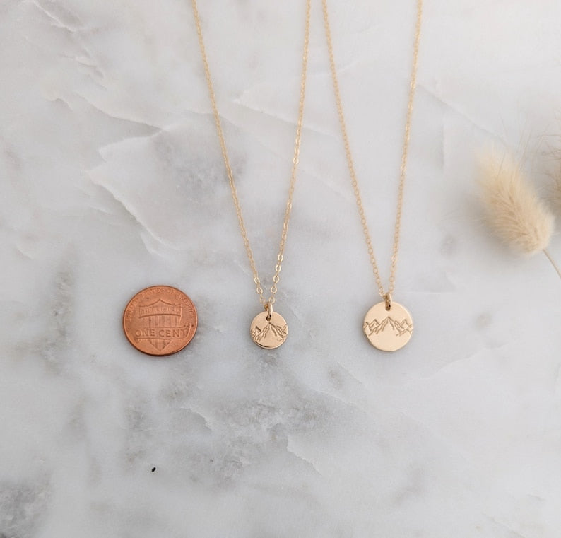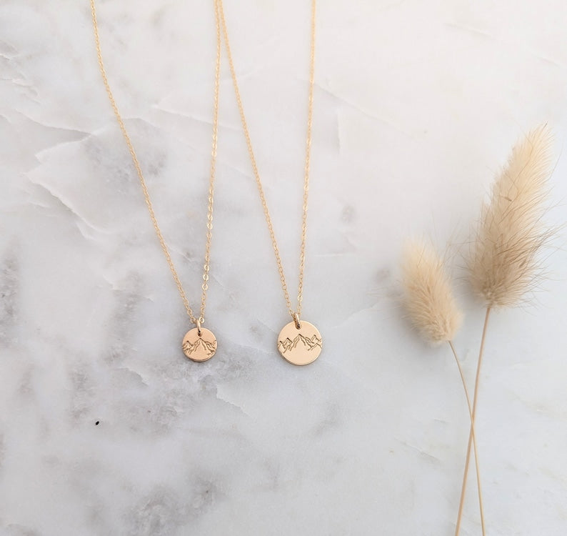 Charm necklace featuring an eclectic mountain design on a "move mountains" necklace card. Created and finished by hand in either 14k gold fill or sterling silver. Available in two sizes, 3/8" (9.5mm) or 1/2" (13mm).