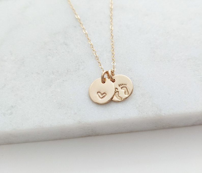 Baby footprint necklace for moms. Charms measure 3/8" (9.5mm) and are personalized with a tiny footprints design and a tiny heart. Includes a cable chain in your choice of length (16"-20") Available in solid .925 sterling silver or 14k gold fill. Selection can be made from the drop down menu.