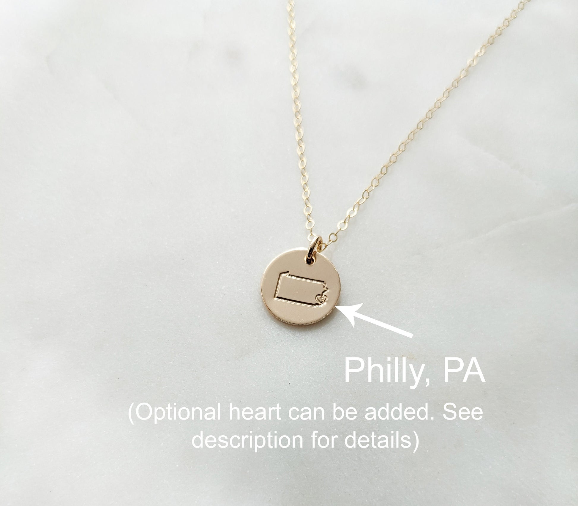 IMPORTANT: Please leave me a note at checkout with the state you would like and city if you would like an optional heart placed over (example: Philadelphia, PA). Please keep in mind these charms are very small (1/2") and while I do my best to place the heart as close as possible to the city, it will not be an exact placement as this process is done by hand, not machine.