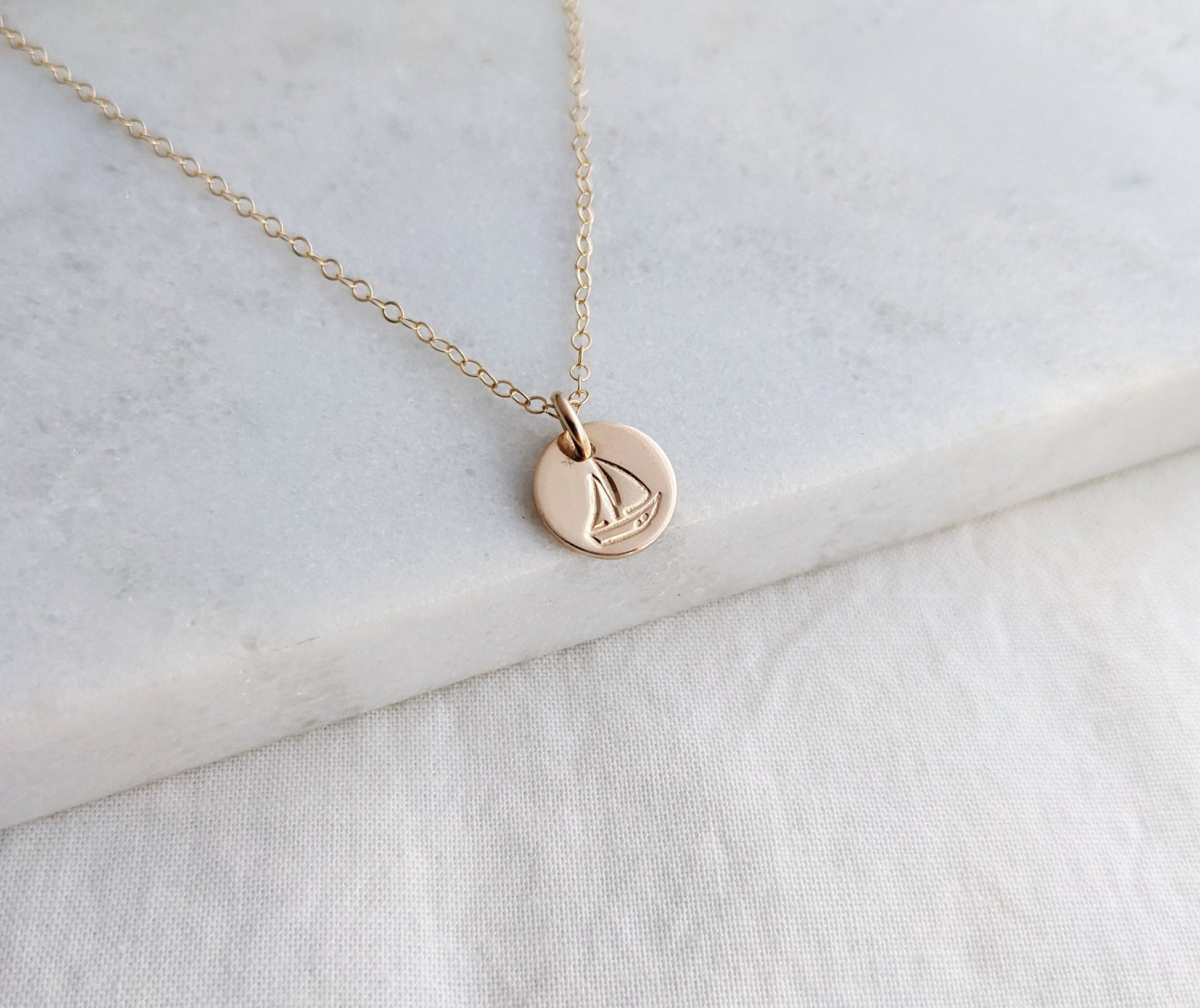 This dainty charm measures 3/8" (9.5mm) and is personalized with a tiny sailboat design. Includes a cable chain in your choice of length (16"-20") Available in solid .925 sterling silver or 14k gold fill. Selection can be made from the drop down menu.