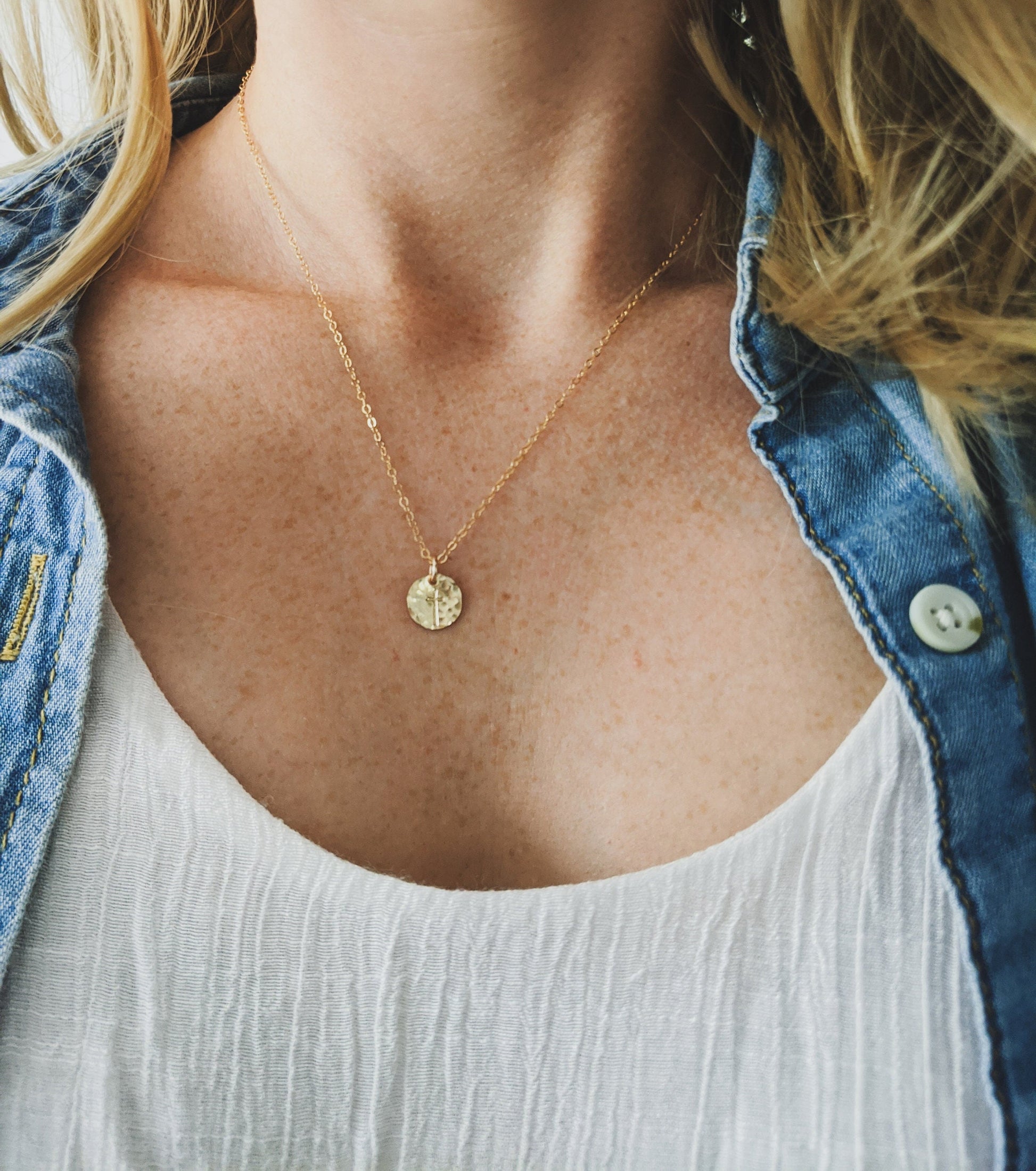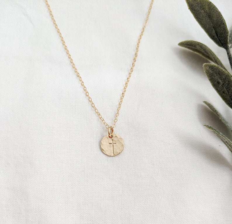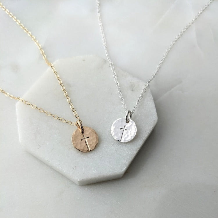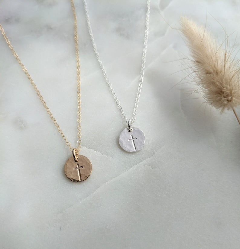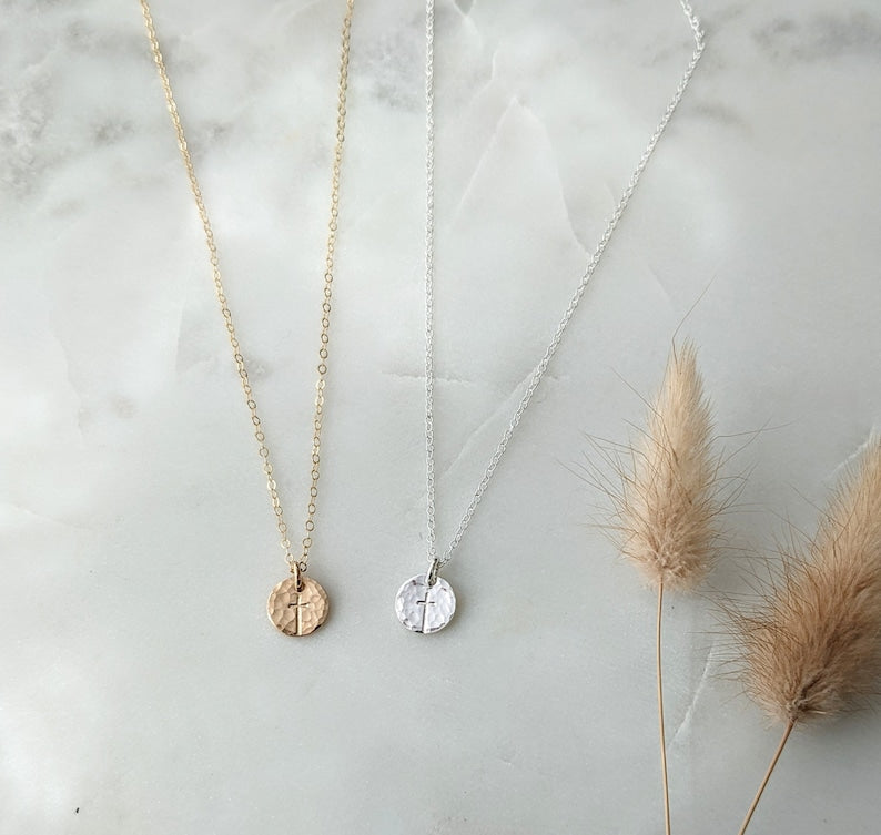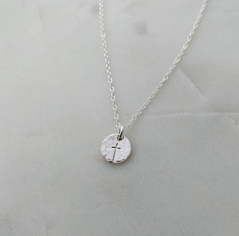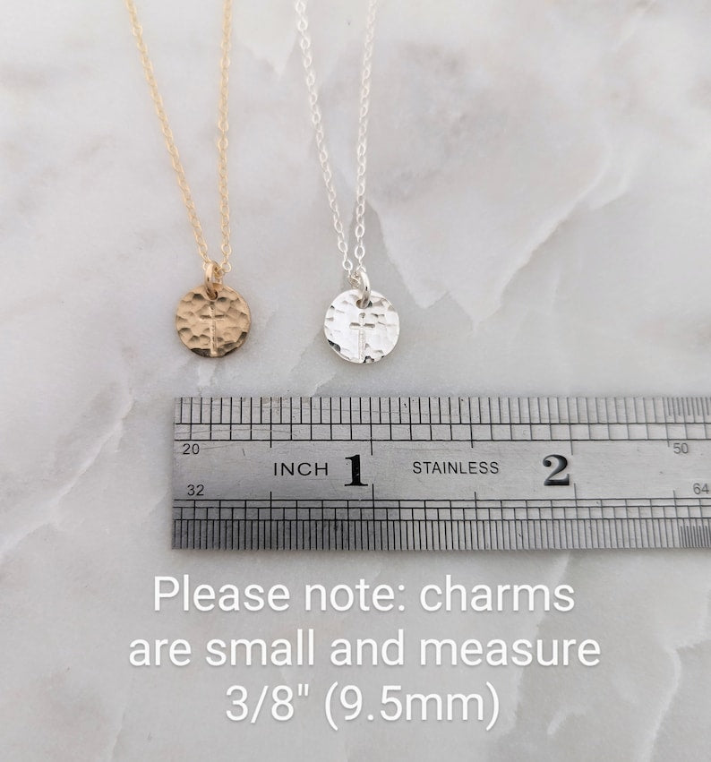 Tiny, minimalist, everyday cross necklace. Cross charm measures 3/8 inch and has been hammered for texture (can be left smooth upon request). All components of this necklace are made of solid sterling silver.