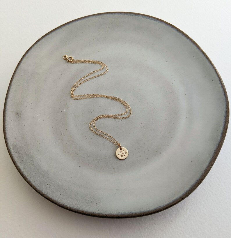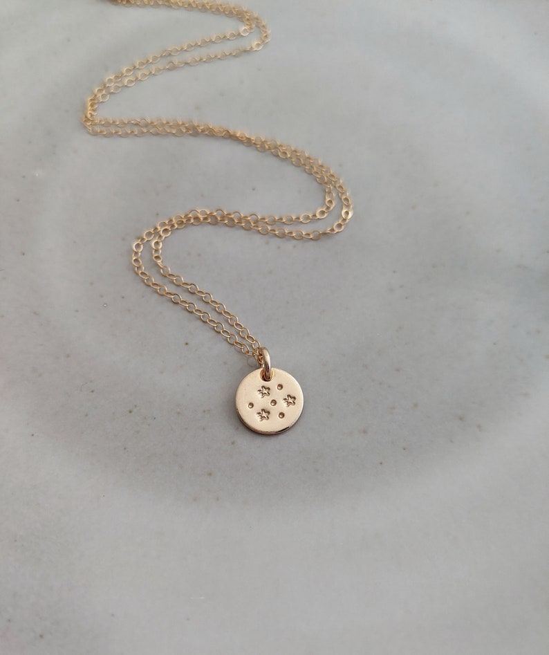 One 3/8" charm hand stamped with a free formed star design. Can be made in 14k gold fill or sterling silver. Selection can be made at checkout.